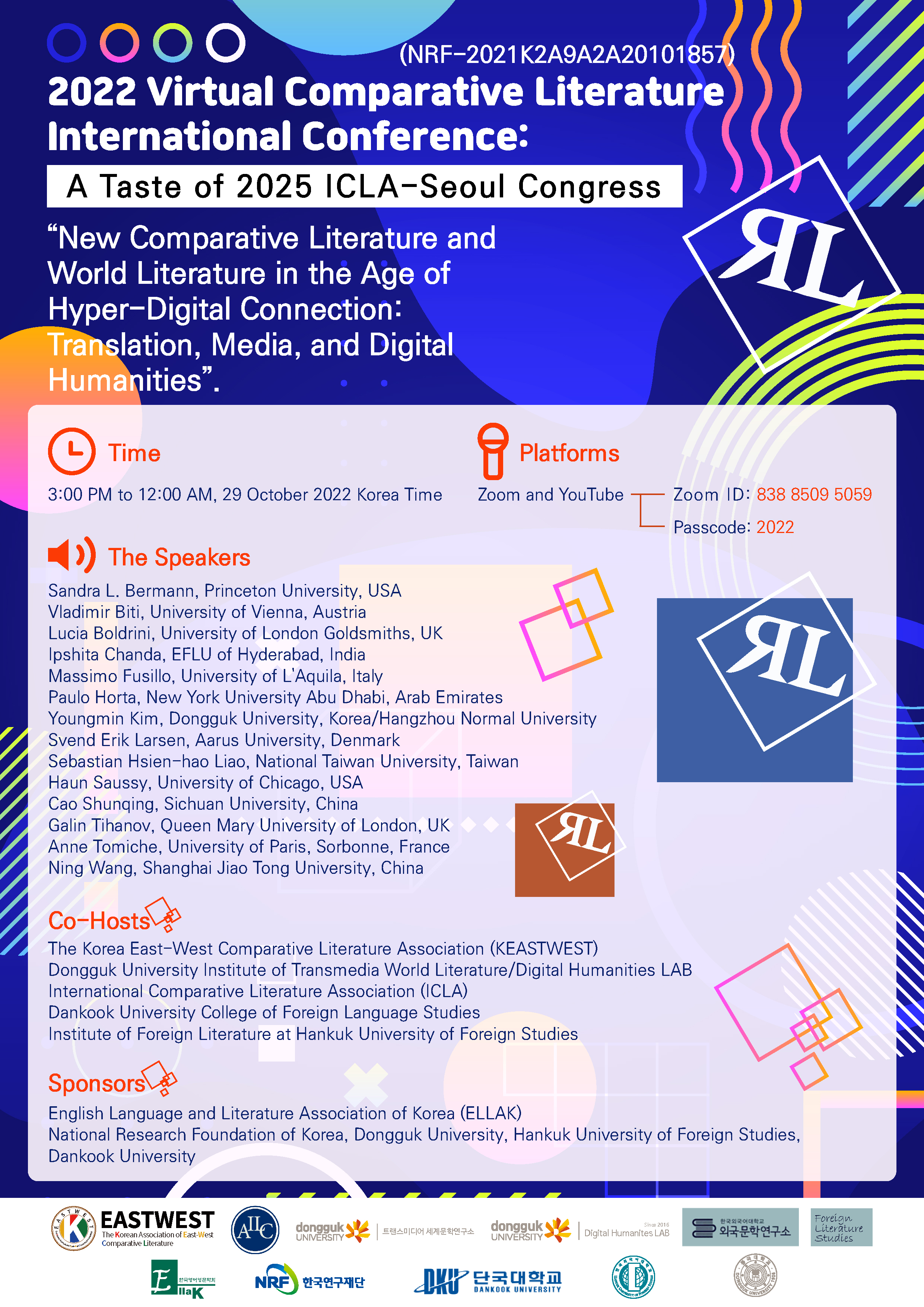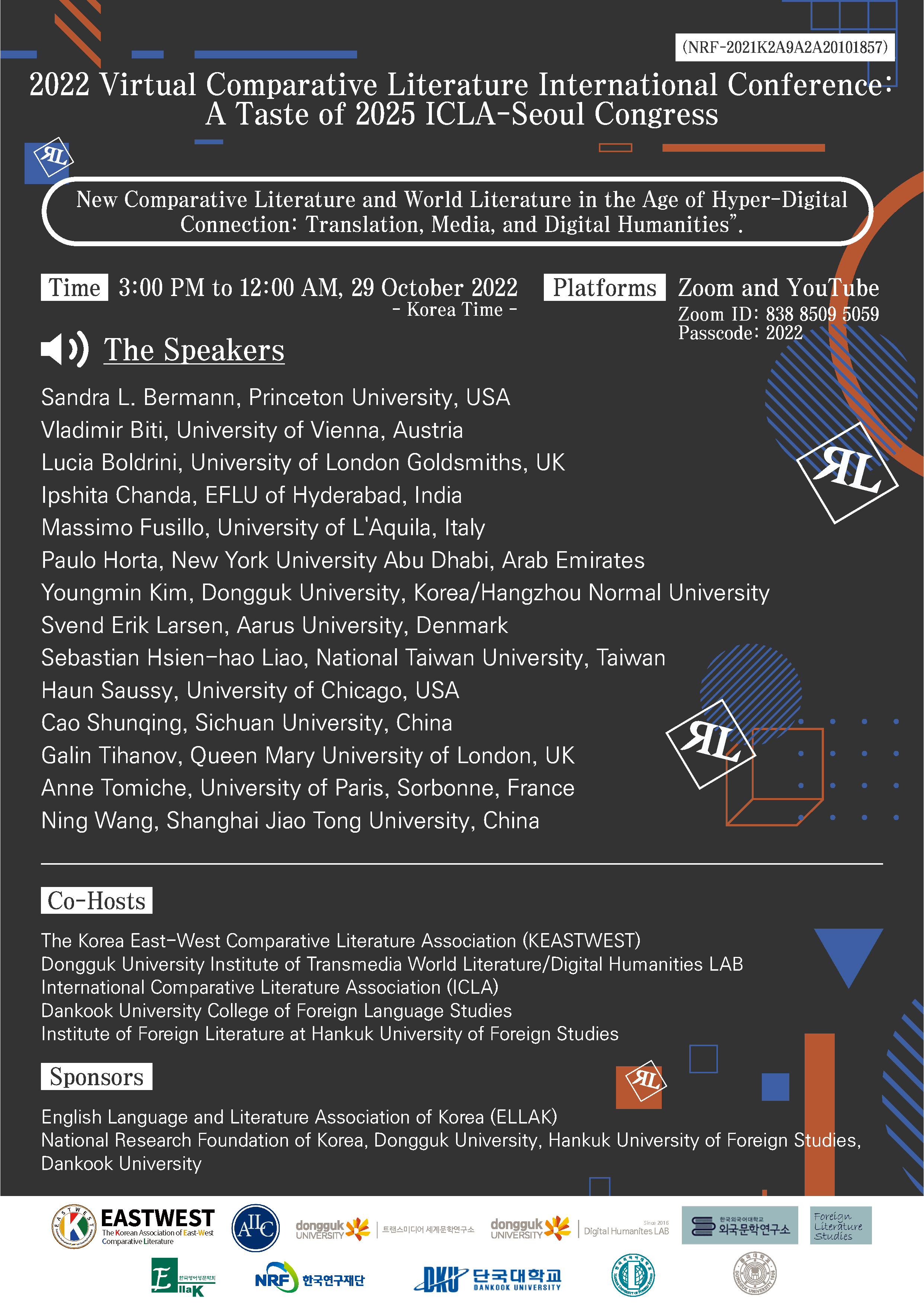외국문학연구소, 한국동서비교문학학회, 한국영어영문학회, 동국대 트랜스미디어세계문학연구소/디지털인문학LAB, ICLA(국제비교문학협회), 단국대외국어대학교, 한국연구재단의 공동주최로 아래와 같이 개최됩니다.
