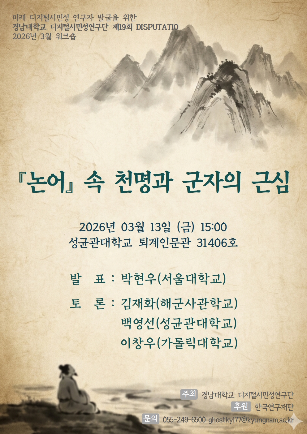 본 연구소는 <디지털시민성 함양을 위한 지역형 인문교양교육 모형 개발 및 확산>이라는 주제로 2021년부터 한국연구재단의 『인문사회연구소지원사업』을 수행하고 있습니다. 해당 연구사업의 여러 목표 중 하나는 “미래의 디지털시민성 담론을 주도할 신진연구자 발굴”입니다. Disputatio는 이러한 목표를 확립하고 확산하는 연구사업의 일환으로 진행하고 있습니다. 2026년의 봄을 알리듯 19회차 디스푸타치오의 문을 열었습니다.