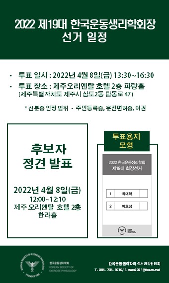2022년 4월 8() 제19대 한국운동생리학회장 선거가 진행됩니다.