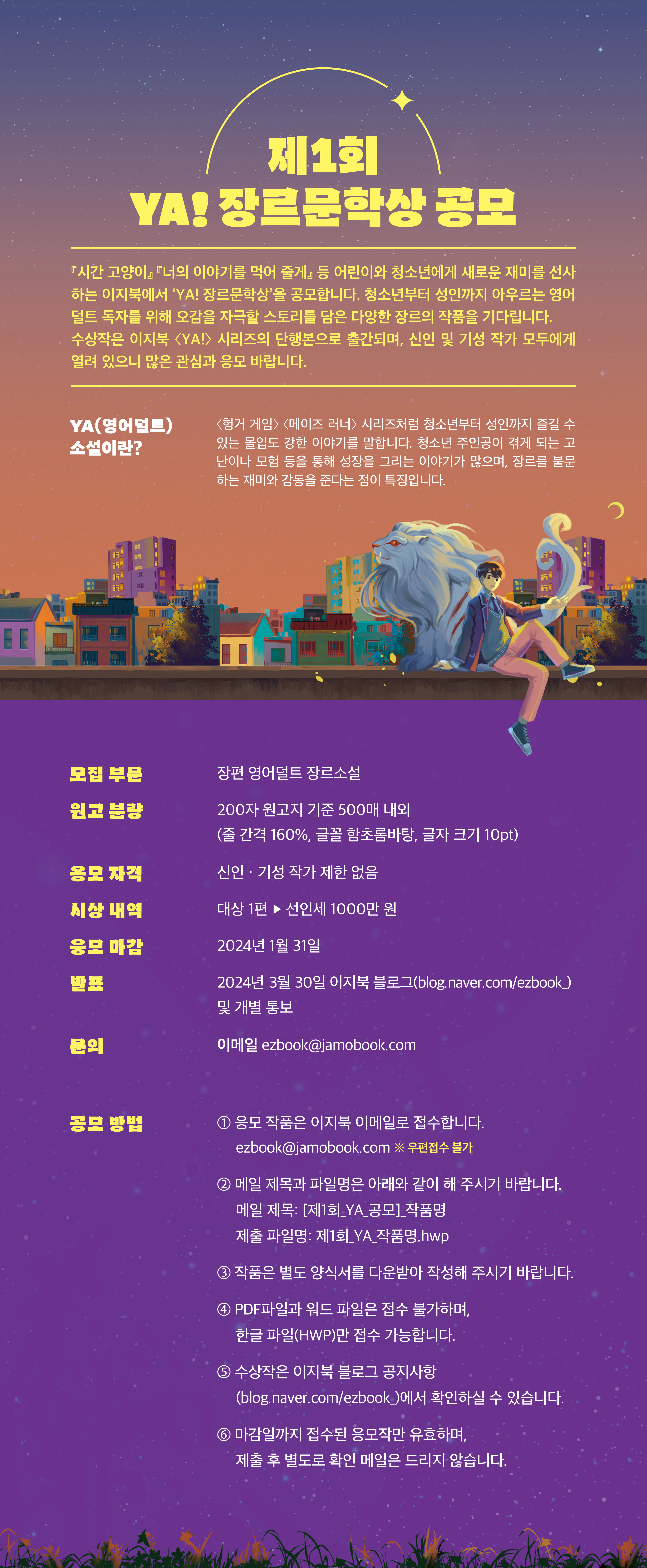 수상작은 이지북 <YA!> 시리즈의 단행본으로 출간되며, 신인 및 기성 작가 모두에게 열려 있으니 많은 관심과 응모 바랍니다.