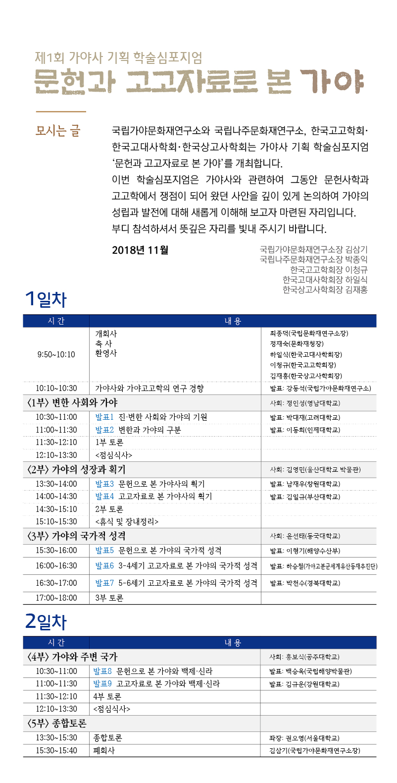 이번 학술심포지엄은 가야사와 관련하여 그동안 문헌사학과 고고학에서 쟁점이 되어 왔던 사안을 깊이 있게 논의하여 가야의 성립과 발전에 대해 새롭게 이해해 보고자 마련된 자리입니다.