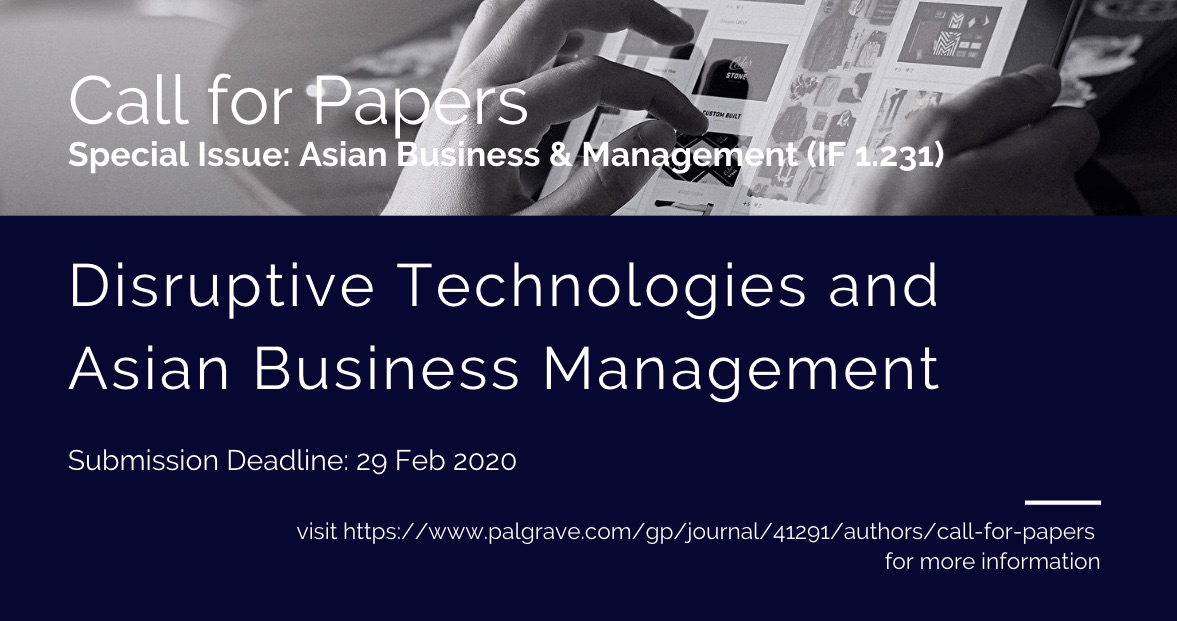 To be considered for the special issue, final manuscripts must be submitted by 29 February 2020 via https://www.editorialmanager.com/jabm/. The submission system will be open from 1 September 2019. To ensure that all manuscripts are correctly identified as being submitted for this special issue, please select ‘SI: Disruptive Technologies’ when you reach the “Article Type” step in the online submission process. Authors should prepare their manuscript according to the guidelines of Asian Business & Management, see: http://www.palgrave.com/gp/journal/41291/authors/presentation-formatting