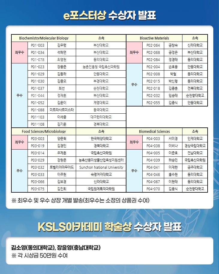 * 팝업창의 공지와 같이, e포스터및 ksls아카데미학술상(YS) 수상자 명단을 알려드립니다.
