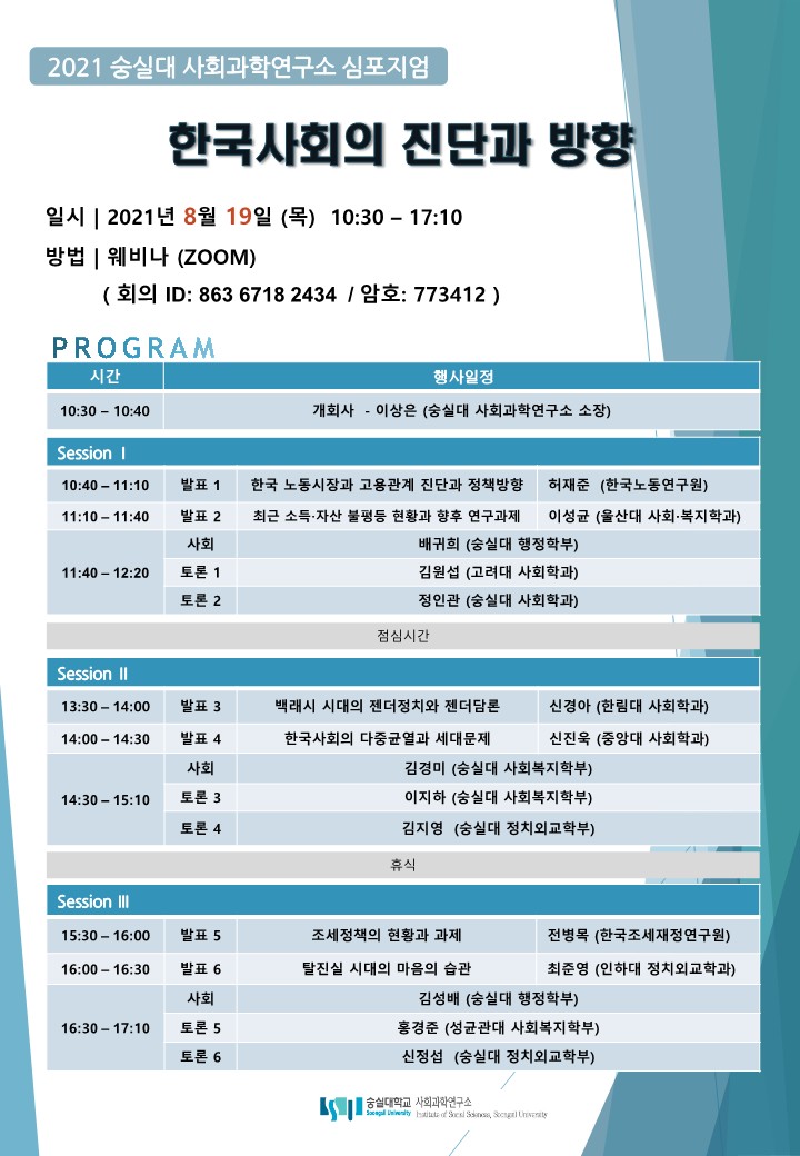 숭실대학교 사회과학연구소에서는 '한국사회의 진단과 방향' 주제로 심포지엄을 개최합니다.