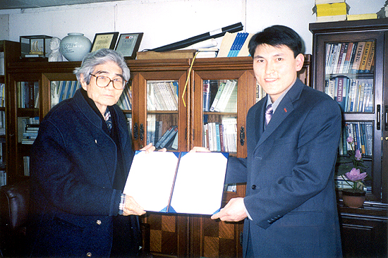 ※ 아래 사진은 지난 2월 19일, 한글 학회에서 전달식을 갖고 있는 한글 학회 허 웅 회장과 넷피아닷컴의 이 판정 대표(오른쪽)의 모습이다.